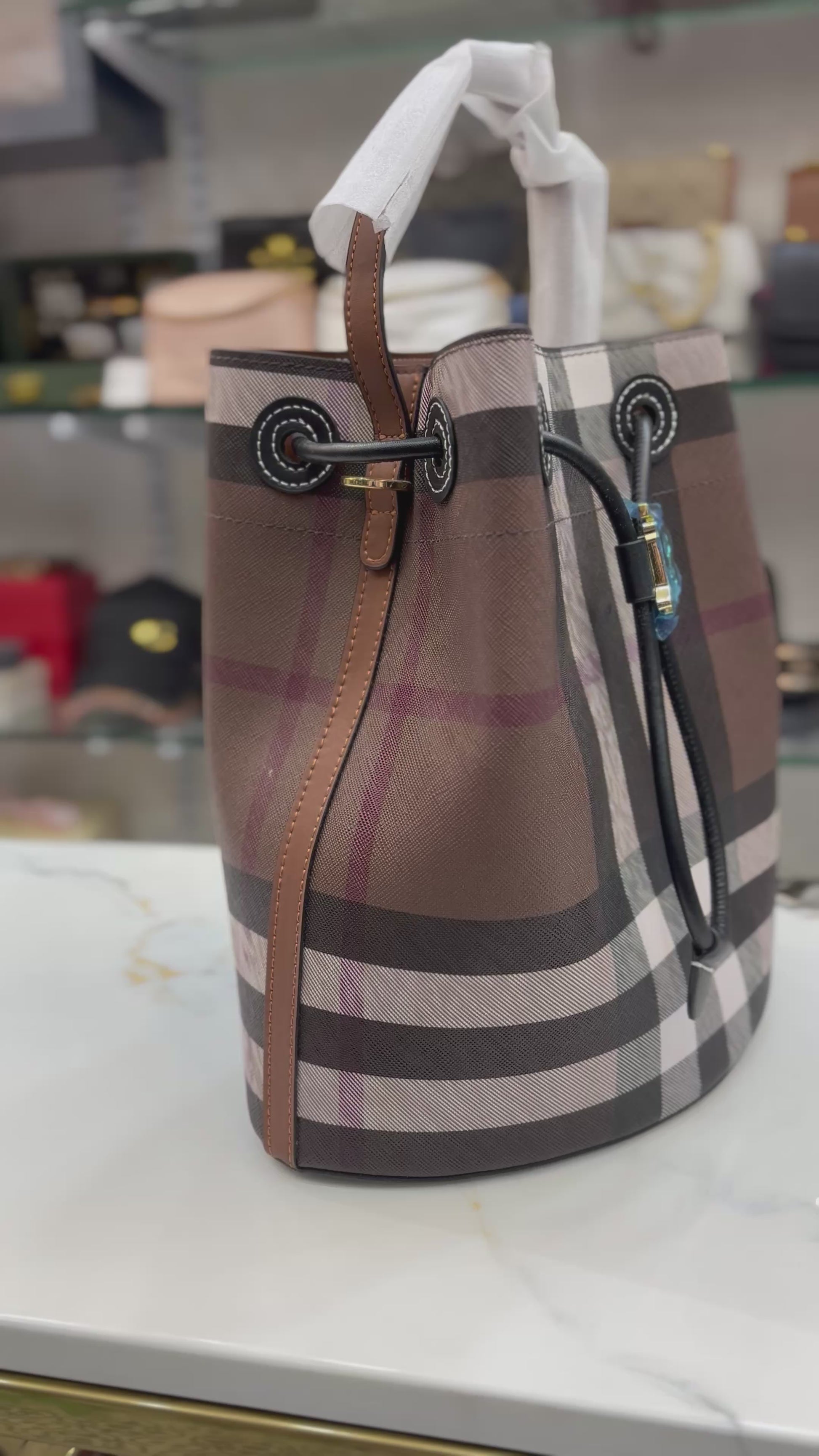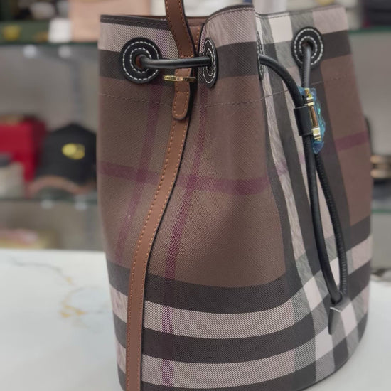 This Burberry bucket bag is expertly made with the finest materials, showcasing the brand's expert craftsmanship. With its timeless design and unmistakable Burberry print, this bag is a must-have for any fashion enthusiast. Own a piece of luxury with this Burberry bucket bag.