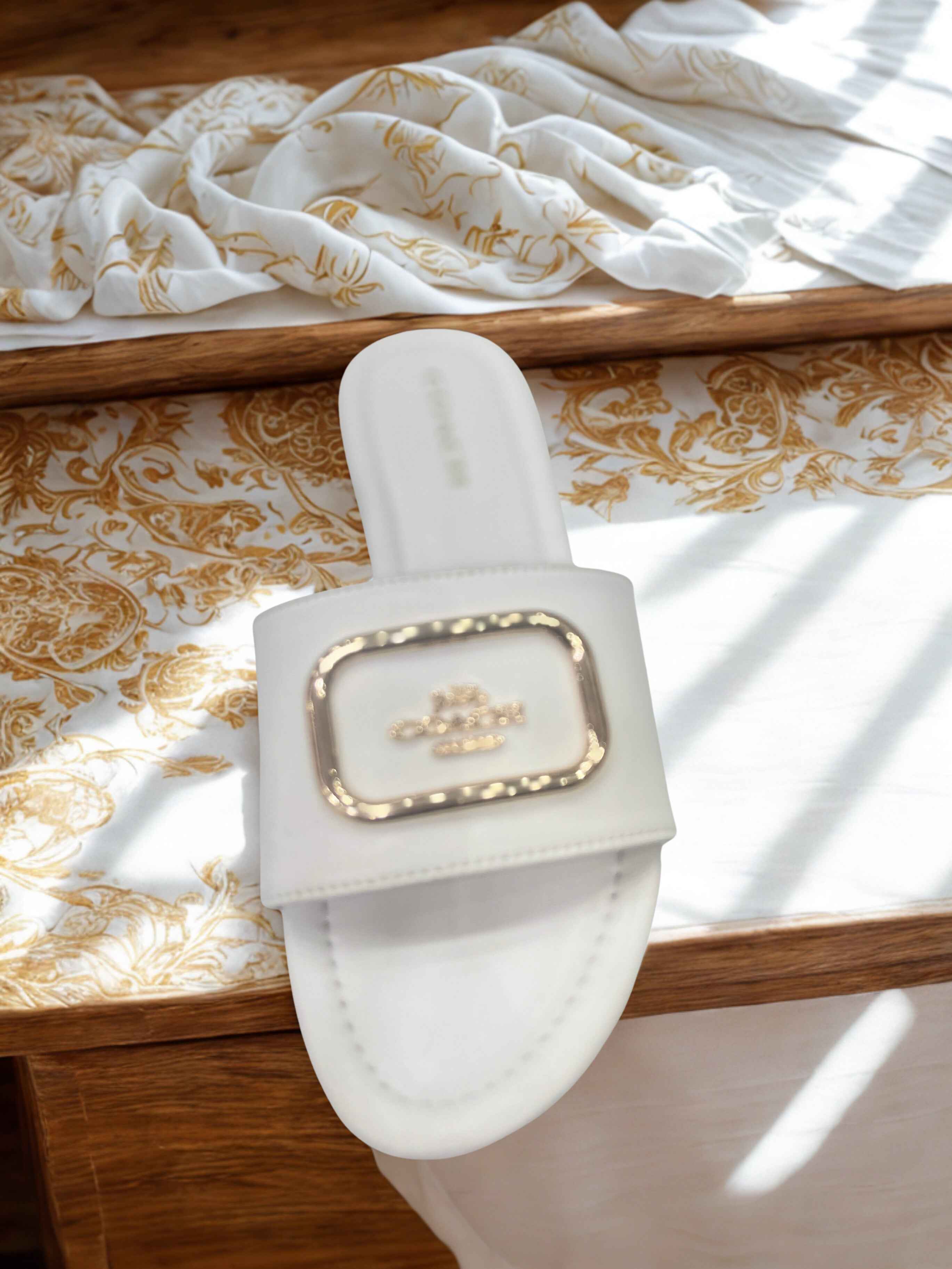 These Coach flat sandle flats are designed with expert craftsmanship and quality materials. The iconic Coach brand brings sophistication and style to any outfit. Made with the finest materials, these flats offer unmatched comfort and durability. Elevate your footwear collection with these timeless and classic flats from Coach.