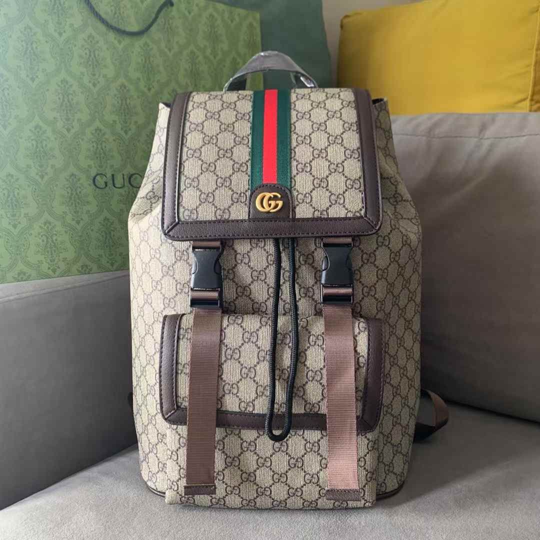 The Ophidia selection of bags, including mini cross-body bags, briefcases and totes has been reshaped with functional details. Featuring a GG Supreme canvas construction in timeless color palettes, the Double G motif defines each style as an integral design element. Here it appears on a beige and ebony backpack.