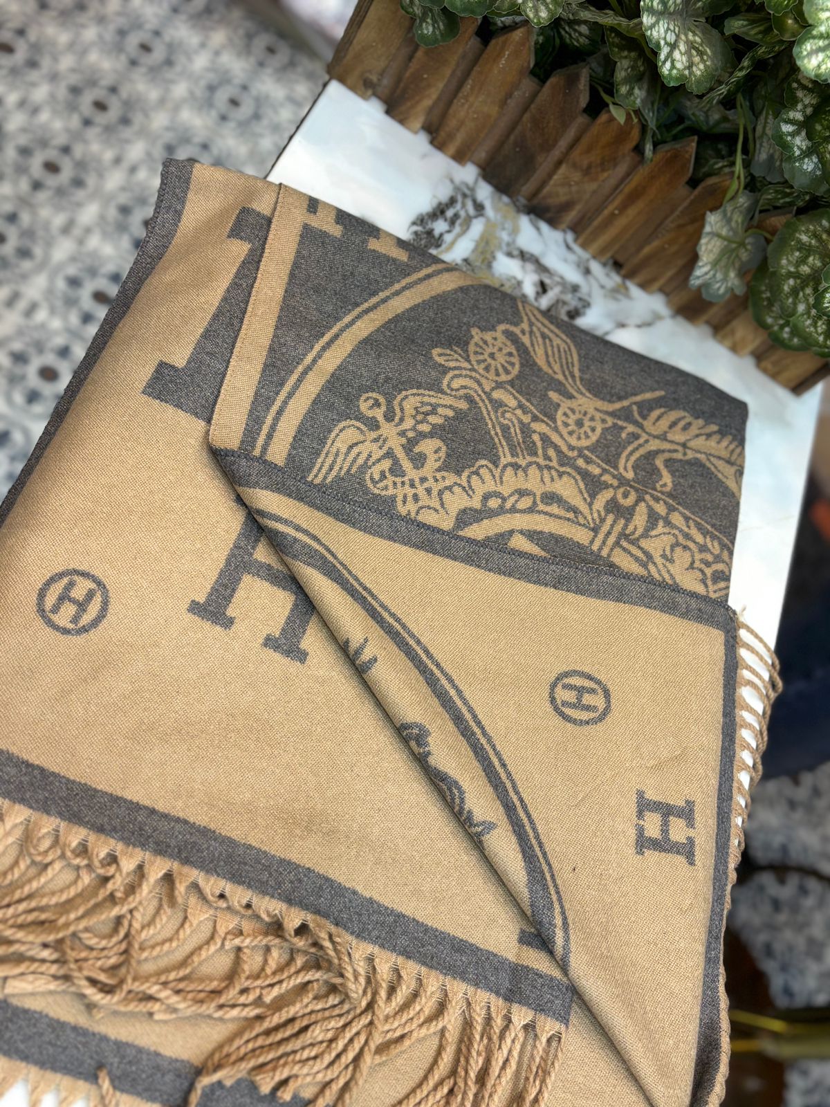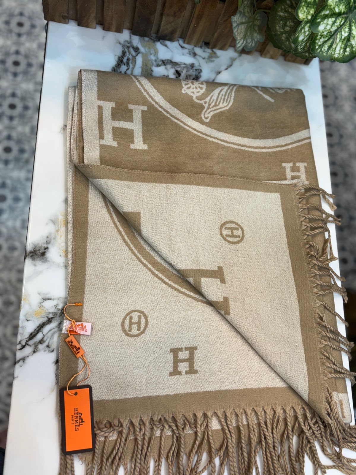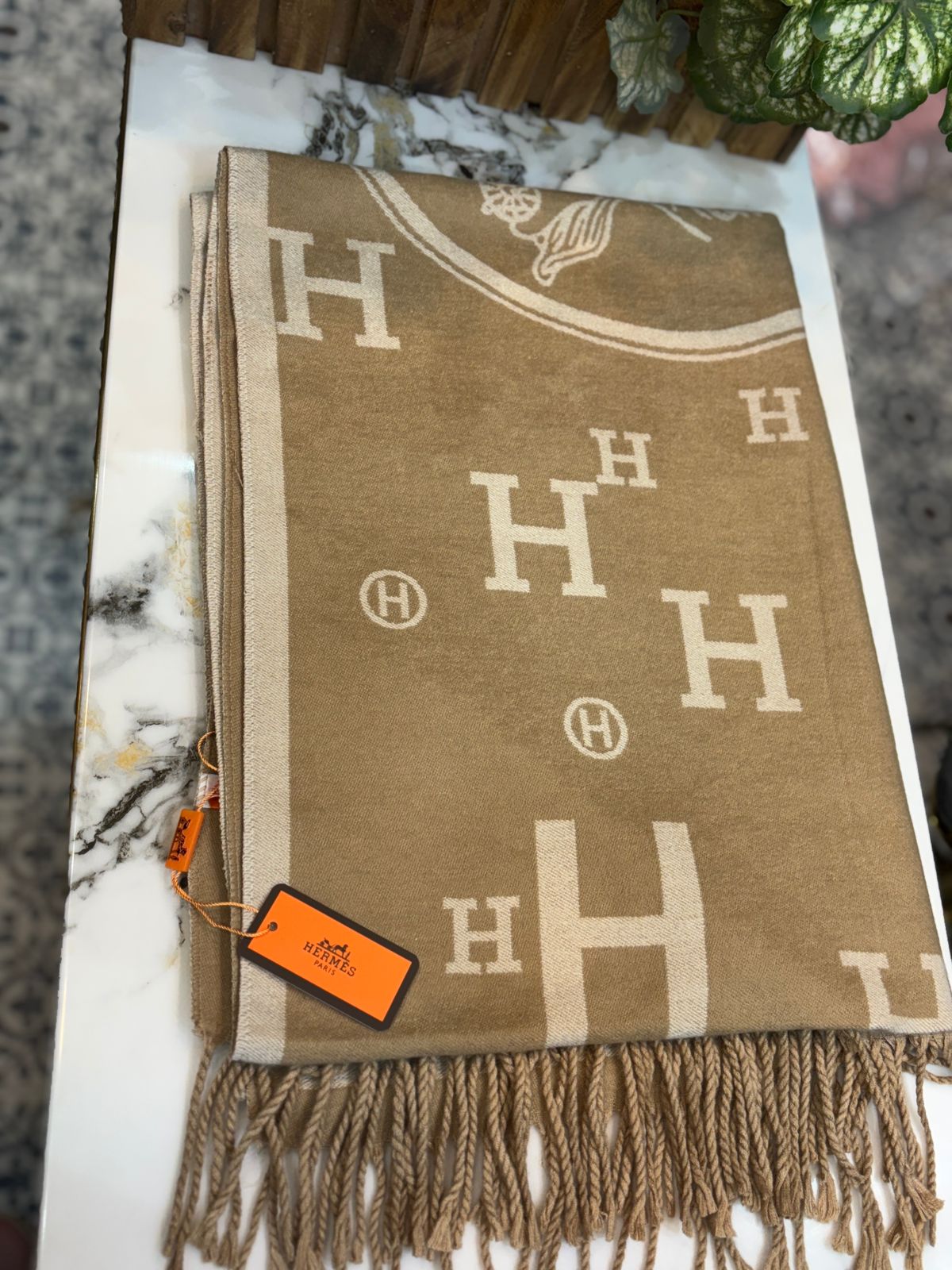 Experience luxury and warmth with the Hermes shawl. Made with full length cashmere, this shawl is sure to keep you cozy and stylish. With the iconic Hermes brand, you can trust in the quality and expertise of this product. Elevate your wardrobe with this timeless accessory.