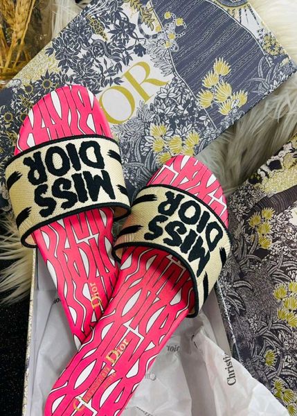 This image features a pair of Miss Dior slides, specifically a flat sandal in a vibrant color with the "MISS DIOR" signature embroidered on the strap.